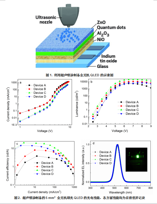 与普通的旋涂工艺相比,超声喷涂技术具有三大优势:一是其节省材料。对于普通的旋涂工艺,在旋涂过程中超过90%的材料被浪费掉了,而喷涂工艺中的材料利用率几乎为100%。而是喷涂工艺可以实现大面积器件的制备,而旋涂技术则不行。这就使得旋涂技术无法应用到工业化生产中。第三是普通旋涂技术无法对器件进行掩膜从而实现像素点的制备,而喷涂技术完全可以兼容掩膜的工艺。而且目前有很多工艺技术用以提高此技术中的掩膜质量,这是成功制备高质量显示器件的最为关键的技术环节。总之,喷涂技术是一种低成本、高效的基于溶液法的薄膜制备工艺,有望在将来的工业化生产中得到应用。