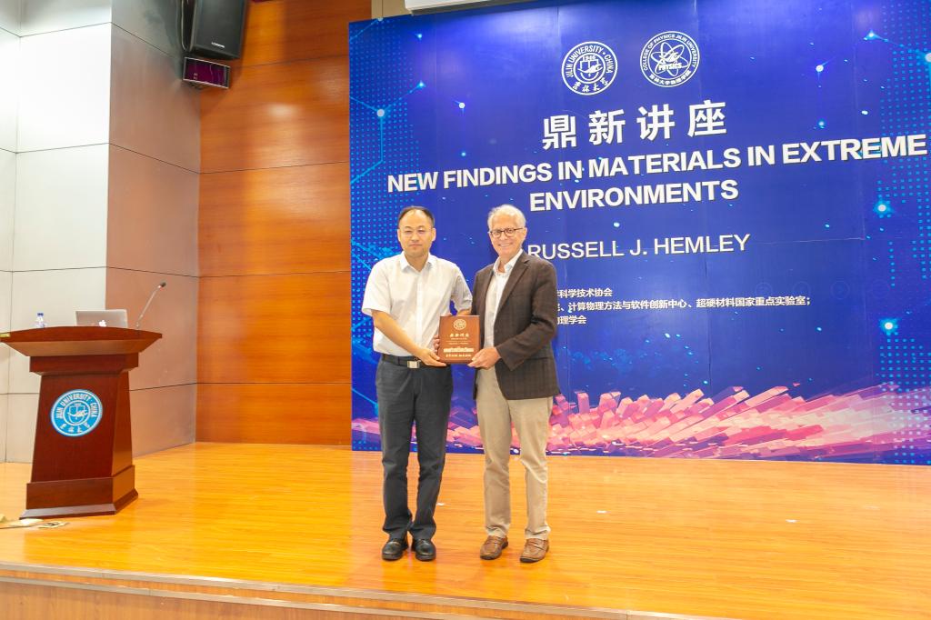 2019年8月24日,国际高压领域著名专家、美国国家科学院院士Russell J. Hemley应邀做客吉林大学鼎新讲座,在国际学术大讲堂为全校师生作题了为“New Findings in Materials in Extreme Environments”的学术报告。suncitygroup太阳集团院长马琰铭教授主持讲座,并为Hemley教授颁发了鼎新讲座纪念牌。