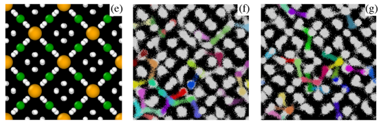 (e)Li2MgH16晶体结构,白球、绿球和黄球分别代表H、Li和Mg;在30K,250GPa(f)和300GPa(g)氢轨迹图,不同彩色代表不同氢的轨迹。