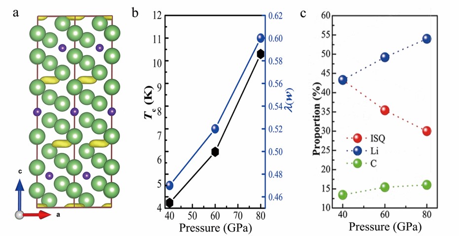 图(a)Li6C电子局域函数;(b)Li6C超导转变温度随压力变化趋势;(c)“准原子”态电子在费米能级处比例随压力变化趋势。
