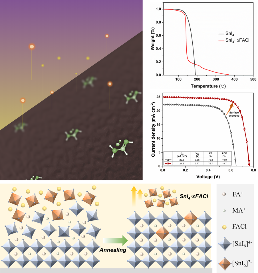 基于此,王宁教授研究团队提出并实现了一种新的工程概念-化学热表面退掺杂,通过深入研究发现甲脒盐酸盐(FACl)能够与钙钛矿薄膜中自发形成的四碘化锡形成配合物(SnI4·xFACl)并降低其升华温度,并在此基础上进一步提出于薄膜表面蒸镀甲脒盐酸盐分子层并在后续的退火过程中实现化学热退掺杂。通过对器件进行一系列表征后发现,钙钛矿薄膜表面的缺陷态密度显著降低且载流子寿命提高了3倍,有效抑制了Sn(Ⅳ)自掺杂对器件性能的影响,实现了14.7% 的能量转换效率。器件效率的提高得益于薄膜中Sn(Ⅳ)空位缺陷态密度的降低,同时退掺杂对薄膜表面能带结构的改善使器件具有更好的能级匹配,有利于载流子的提取和输运。该器件在氮气氛围下保存1000小时后仍具有92%的初始效率保留率,具有良好的稳定性。该工程概念为解决锡基钙钛矿薄膜中Sn(Ⅳ)自掺杂问题以及制备高性能锡基钙钛矿太阳电池提供了新的思路和理论指导。