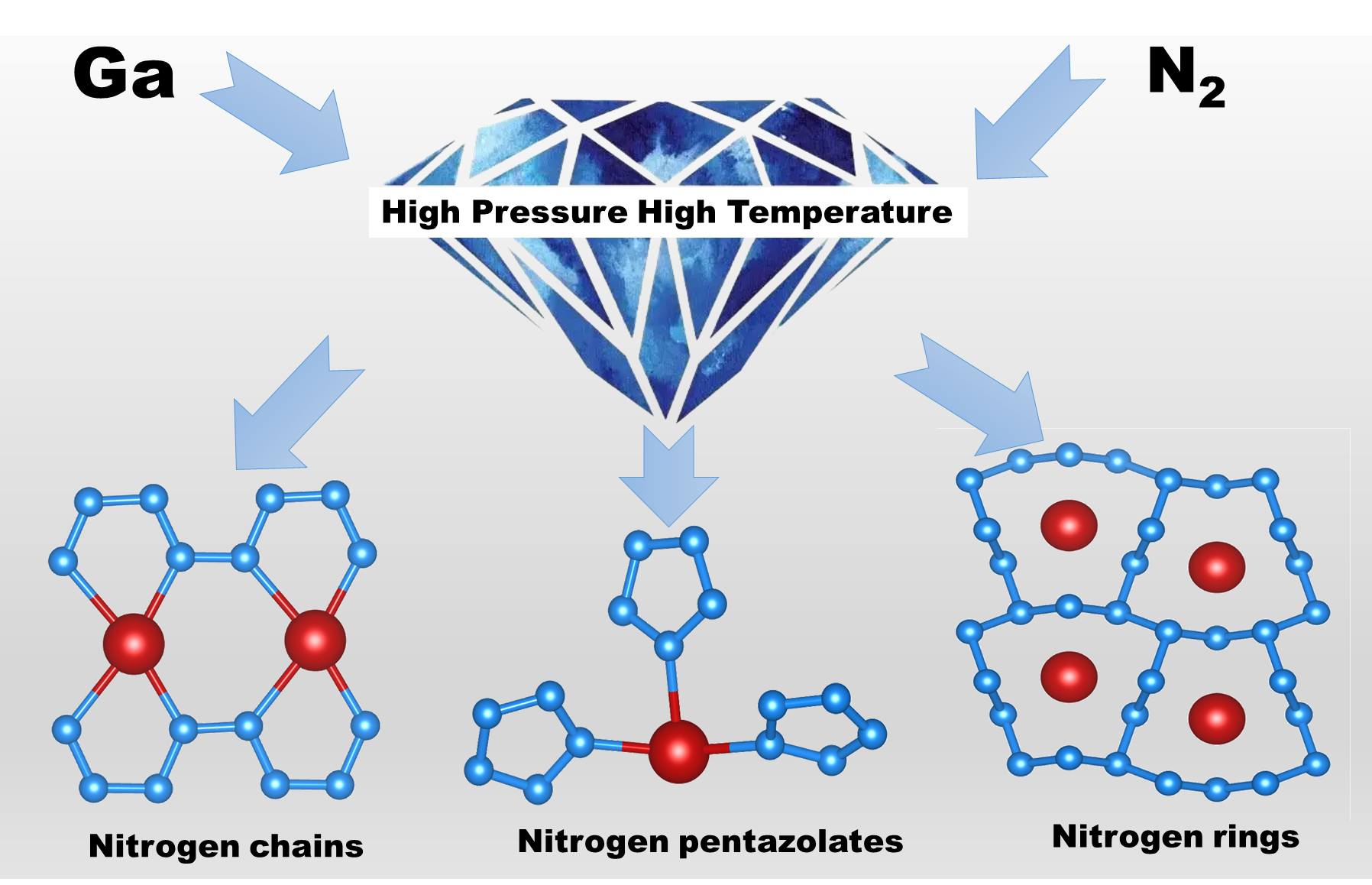 本工作利用CALYPSO晶体结构预测方法,系统研究了高压下Ga-N体系的热力学稳定性,理论预言出三种全新化学计量比的富氮化合物GaNx(x = 5,10,15)。同时,利用激光辅助加热金刚石对顶砧高压实验装置,在85GPa的压强下成功合成出GaN5和GaN10。三种Ga-N化合物都具有丰富的化学键合行为和新奇的聚合氮拓扑结构。它们能量密度(4.1–5.3 kJ/g)与传统炸药(如TNT、HMX等)相媲美,且合成压强远低于聚合氮的制备条件。当前研究提出了通过p区元素与N2高压化学反应来设计高能量密度材料的新思路,拓展了富氮化合物的家族成员。