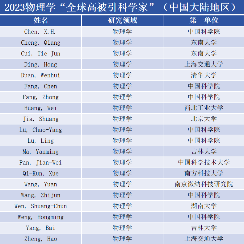 在物理学领域,中国大陆地区共有20位学者入选。马琰铭教授再次入选,这也是马琰铭教授连续第七年入选。