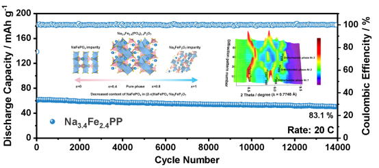 Fe基杂化磷酸盐材料Na4Fe3(PO4)2P2O7由于其优异的电化学性能逐渐受到研究者的广泛关注,然而其在合成过程容易产生不具有电化学活性的m-NaFePO4杂相,制约了其性能的进一步发挥。此外,目前普遍认为Na4Fe3(PO4)2P2O7的结构演化机制为单相固溶,然而这与其充放电曲线的平台特征相悖,相关机制仍需进一步明晰。