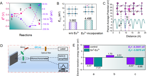 (A) 通过E0和吉布斯自由能ΔG0比较四种可能发生的反应。G0 = -nFE0,其中n为反应中转移的电子数,F为法拉第常数)。(B)Eu2+掺杂前后VI的形成能。(C)电荷转移过程中各位置平均静电势的计算。其中,a、b和c表示不同位置的静电势:黑色虚线表示电荷通过有FA存在的碘骨架时的静电势;紫色虚线表示电荷通过无机八面体框架时的静电势;玫瑰色虚线表示电荷通过有FA存在的Eu2+结合碘骨架时的静电电位。(D)荧光系统测试示意图。(E)两种情况对应的电荷跃迁势垒。