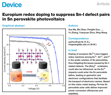 近日,suncitygroup太阳集团凝聚态物理系王宁教授团队在无铅钙钛矿太阳电池研究方面取得进展,相关成果以Europium Redox Doping to Suppress Sn-I Defect Pairs in Sn Perovskite Photovoltaics”为题发表在国际知名学术期刊Device