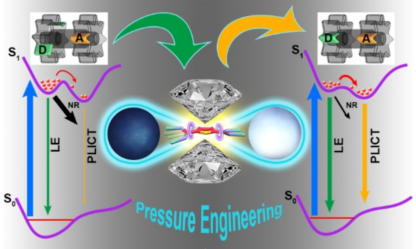 在本工作中,杨新一课题组选择具有局部激发态(LE)和平面化分子内电荷转移态(PLICT)双发射的[Zn(Tdc)(py)]nMOF纳米晶作为研究对象。由于初始扭曲的电子供体-受体结构,该MOF材料的PLICT发射较弱,呈现出弱蓝色荧光。高压下PLICT态的荧光显著增强,材料转变为白光发射。压强完全释放后,截获5倍增强的明亮白色荧光,色标和色温分别为(0.31, 0.37)和6560 K。原位高压同步辐射X射线衍射和红外吸收光谱研究表明,压强处理后增强的S···O硫族元素键锁住了电子供体-受体间减小的二面角,促使PLICT态荧光显著增强,结合LE态荧光实现高效白色发射。进一步,密度泛函理论计算表明,压强处理后的平面结构导致初始的从噻吩羧基向吡啶的电荷转移通道关闭,减少了吡啶自由转动引起的非辐射损耗,诱导荧光增强。基于压强处理后的样品,制备了pc-LEDs器件,展现出良好的白光性能和稳定性,该工作为设计和制备高性能的非掺杂白光MOFs提供了全新的思路。
