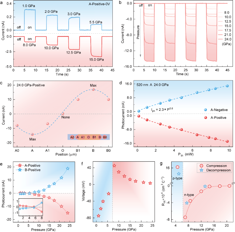 已有研究发现压强能够诱导功能材料的导电类型发生转变,但这种转变常伴随半导体-金属转变,极大地限制了其在半导体领域的应用。近期,刘冰冰教授、李全军教授团队在二维范德华层状半导体NbOI2,通过压强调制的Peierls畸变实现了其半导体-半导体相变过程中的n-p导电类型切换,首次在具有较大带隙的半导体中实现压强诱导的导电类型转换J. Am. Chem. Soc. 2024, 146, 25245)。在此基础上,该研究团队进一步提出了一种基于光热电效应主导的自驱动光电流来判断载流子极性的新方法,并进一步揭示了高压下正-负光电导转换与载流子类型切换之间的关联。该研究选取了金属卤化物BiI3作为研究对象,采用高压工程实现了BiI3导电类型及自驱动光电流的显著极性切换,并显著提升了其光响应特性。以往研究通常将高压下负光电导的出现归因于载流子类型的切换,但在光电流测试中施加偏压会对载流子类型的判断产生误导。为了排除偏压对判断载流子类型的影响,研究者采用聚焦光斑对样品进行局部照射,利用光热效应产生载流子浓度梯度,从而自发形成光电流。这种光热电效应产生的光电流方向可直接反映载流子的极性。研究发现,当激光照射于BiI3样品与电极接触的一端时(A点),产生正向的自驱动光电流;而当压力超过5.5 GPa时,光电流方向发生反转,指示BiI3导电类型发生了p-n切换。霍尔效应测量进一步验证了该导电类型的转换。这一发现不仅为半导体导电类型的定性测量提供了新方法,还澄清了高压下正-负光电导转换来源的相关争议。此外,压力还显著的提升了BiI3的光电响应特性,其光电流在压力下有超过3个数量级的提升,在光热协同效应的作用下其光谱响应范围也成功扩展至光通讯波段(1650 nm)。这些发现不仅有助于深化对半导体载流子行为的理解,还为逻辑电路的设计和器件性能的优化提供了宝贵的见解。