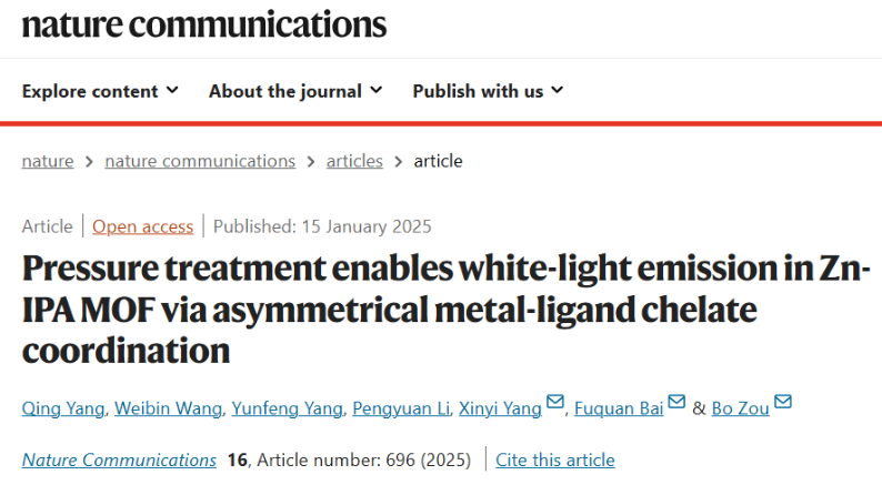 近日,吉林大学高压与超硬材料全国重点实验室/综合极端条件高压科学中心杨新一教授等人基于压强处理工程调控Zn-IPA金属-有机框架(MOFs)材料的结构刚性和配位构型,实现了Zn-IPA高效荧光/磷光混合型白光发射。相关成果以“Pressure treatment enables white-light emission in Zn-IPA MOF via asymmetrical metal-ligand chelate coordination”为题发表在《Nature Communications》(Nat. Commun. 2025, 16, 696)上。