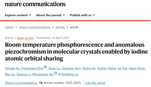 近日,suncitygroup太阳集团高压与超硬材料全国重点实验室刘冰冰、姚明光教授等人通过高压调控二碘四氟苯(1,4-DITFB)分子晶体中碘原子与近邻分子的“轨道共享”,首次在该体系中实现了压强诱导从无到有、蓝移增强和寿命延长的室温磷光(RTP)发射。相关成果以“Room-temperature phosphorescence and anomalous piezochromism in molecular crystals enabled by iodine atomic orbital sharing”为题发表在国际权威学术期刊《Nature Communications》上。
