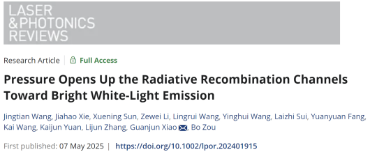 近日,suncitygroup太阳集团高压与超硬材料全国重点实验室邹勃教授团队肖冠军教授等人在全无机非铅金属卤化物的压强诱导发光研究中取得重要进展,通过高压打开了辐射跃迁通道,实现了一维金属卤化物Cs2AgI3从“无光”到“有光”的反常压强诱导PIE行为(Pressure-Induced Emission, PIE),产生了高压下的高品质明亮白光发射,并深入揭示了背后的物理机制,推动了压力传感、压力开关和高压极端条件下的特种照明与显示应用。相关研究成果以“Pressure Opens Up the Radiative Recombination Channels Toward Bright White-Light Emission”为题发表在《Laser & Photonics Reviews》上。