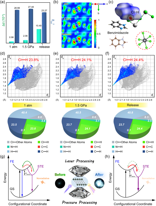 本工作中,肖冠军教授等人选择二维杂化卤化物(C7H7N2)2PbCl4作为研究对象,通过压强处理工程调控其结构畸变,实现了高质量的白光发射,其CIE色度坐标为(0.34,0.38),色温CCT为5245 K。从20.0 GPa释放压强后,材料白光发射强度实现近五倍提升。电子局域函数(ELF)计算表明,卸压后无机卤化物八面体内部的电子密度显著增加,导致带边激子局域化增强,提高了自陷态激子辐射复合几率。Hirshfeld表面理论计算表明,卸压后N−H···Cl相互作用比例同样提升至24.4%。结合同步辐射X射线衍射分析,其不可逆特性源于[PbCl6]4-八面体畸变加剧、有机苯并咪唑基团的空间位阻效应以及分子间N−H···Cl氢键增强三者协同作用导致的不可逆部分非晶化,增加了电子-声子耦合强度,提高了去自陷活化能,从而提高自陷态激子浓度,有效地促进辐射复合,抑制非辐射跃迁。