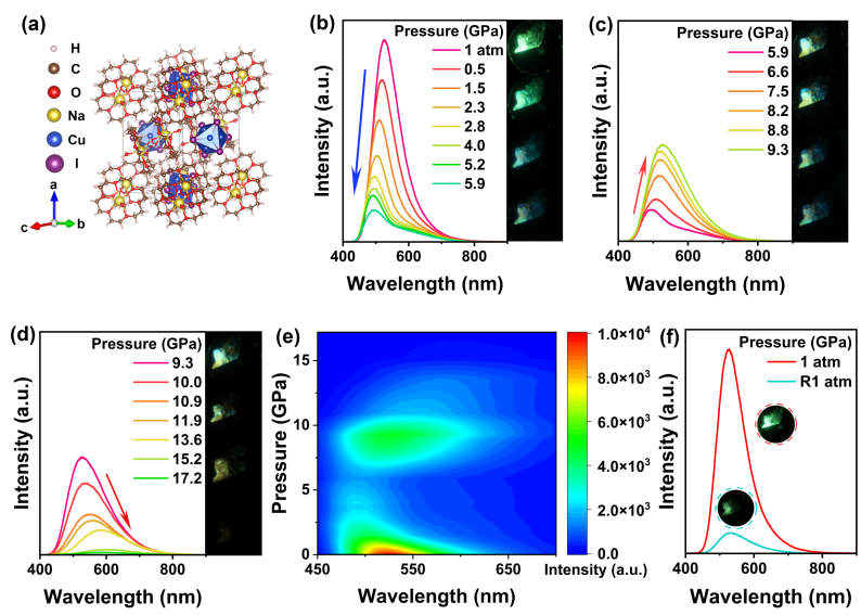 铜(I)基卤化物由于其良好的结构稳定性、环境友好性以及可调谐的光致发光性能,已成为无铅发光材料的重要候选者。零维结构的Cu(I)基有机金属卤化物 (C₁₂H₂₄O₆)₂Na₂(H₂O)₃Cu₄I₆,因其自陷态激子发射特性,在固态照明和新型光学器件中展现出巨大应用潜力。该材料在常压下已具备较高的光致发光量子效率,但其在高压极端条件下的复杂光物理行为、结构-性能关系仍有待深入探索。