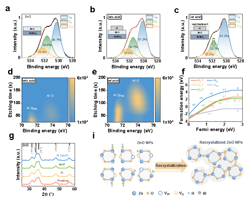 Fig. 3 | Operando chemical reactions of ZnO NPs. a-c, Deconvolution of the O 1 s XPS peaks of the (a) pristine ZnO film. (b) Al-deposited ZnO film without acid treatment and (c) Al-deposited ZnO film with acid treatment. d-e Evolution of the Al 2p XPS peaks of the Al-deposited ZnO films (d) without acid treatment and (e) with acid treatment as a function of the Ar ion etching time. f, Formation energies of various defects in ZnO films with Al doping. g, XRD patterns of four ZnO samples: pristine ZnO, Al-deposited ZnO film (Al), ZnO film with acid treatment (acid), and Al-deposited ZnO film with acid treatment (Al (acid)). i, Schematic illustration of the recrystallization process of ZnO nanoparticles.