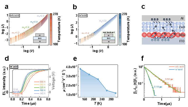 Fig. 2 | Electron transport properties of the ZnO NP films. a-b, J-V characteristics of Al/ZnO/Al devices (a) without acid treatment and (b) with acid treatment at different temperatures. The symbols represent the experimental results, with colors corresponding to the measurement temperatures. c, A schematic diagram of the device structure ITO/QDs/ZnO/Al and its working mechanism for measuring electron mobility in ZnO. d, TrEL spectra of ITO/QD/ZnO/Al devices at different temperatures. e, Temperature-dependent mobility of a ZnO film with acid treatment. f, Plot of