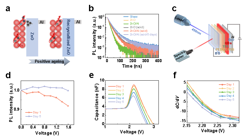 Fig. 5 | Charge–carrier dynamics in the QDs. a, Schematic illustration depicting exciton quenching of QDs by ZnO before and after recrystallization. b, PL decay curves measured for the QDs under different conditions: QDs on glass, denoted as glass; glass/QDs/ZnO, denoted as ZnO; glass/QDs/ZnO/Al, denoted as ZnO/Al; glass/QDs/ZnO with acid treatment, denoted as ZnO (acid); glass/QDs/ZnO/Al with acid treatment, denoted as ZnO/Al (acid); and glass/QDs/ZnO/Al with acid treatment after 5 days of aging, denoted as ZnO/Al (acid-5 days). c, Schematic diagram of the setup for PL spectra testing at a voltage below the turn-on voltage for electroluminescence. d, PL intensity versus voltage curves of the device before and after aging. e, Capacitance‒voltage curves of the device during positive aging, and f, the derivative of capacitance (dC/dV) as a function of voltage (V) during positive aging.