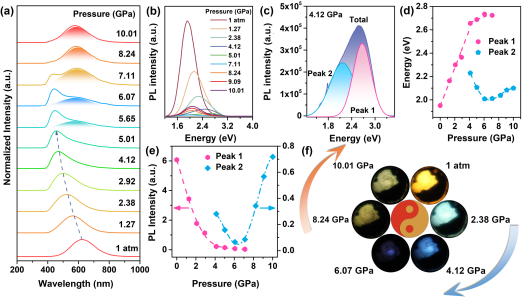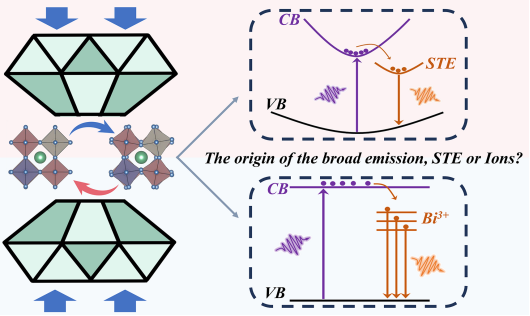 近日,suncitygroup太阳集团高压与超硬材料全国重点实验室邹勃教授团队肖冠军教授等人,通过引入高压维度,探索合金双钙钛矿Cs2AgIn0.9Bi0.1Cl6纳米晶宽辐射发光的压力响应,成功揭示了高亮度宽辐射发光主要源于自陷态激子发光,而非ns2电子组态的金属Bi3+离子发光,解决了长期以来关于Cs2AgIn0.9Bi0.1Cl6纳米晶宽辐射发光起源的争议。研究表明,宽辐射发光包含了两种自陷态,分别与BiCl6-AgCl6和InCl6-AgCl6两种八面体结构有关。高压下晶体场强度和宽发射波长之间的负相关性,排除了宽发射源于Bi3+从3Pn(n=0,1,2)到1S0跃迁,从而为其宽发射源于自陷态激子辐射复合提供有力的压力依据,进一步加深了对铟基双钙钛矿光物理机制的理解,促进高压为常压科学服务。相关工作以“Self-Trapped Excitons or Bi3+ Ions for Broad Emission in a Lead-Free Double Perovskite? Hearing What Pressure Says”为题,发表在《Nano Letters》上。