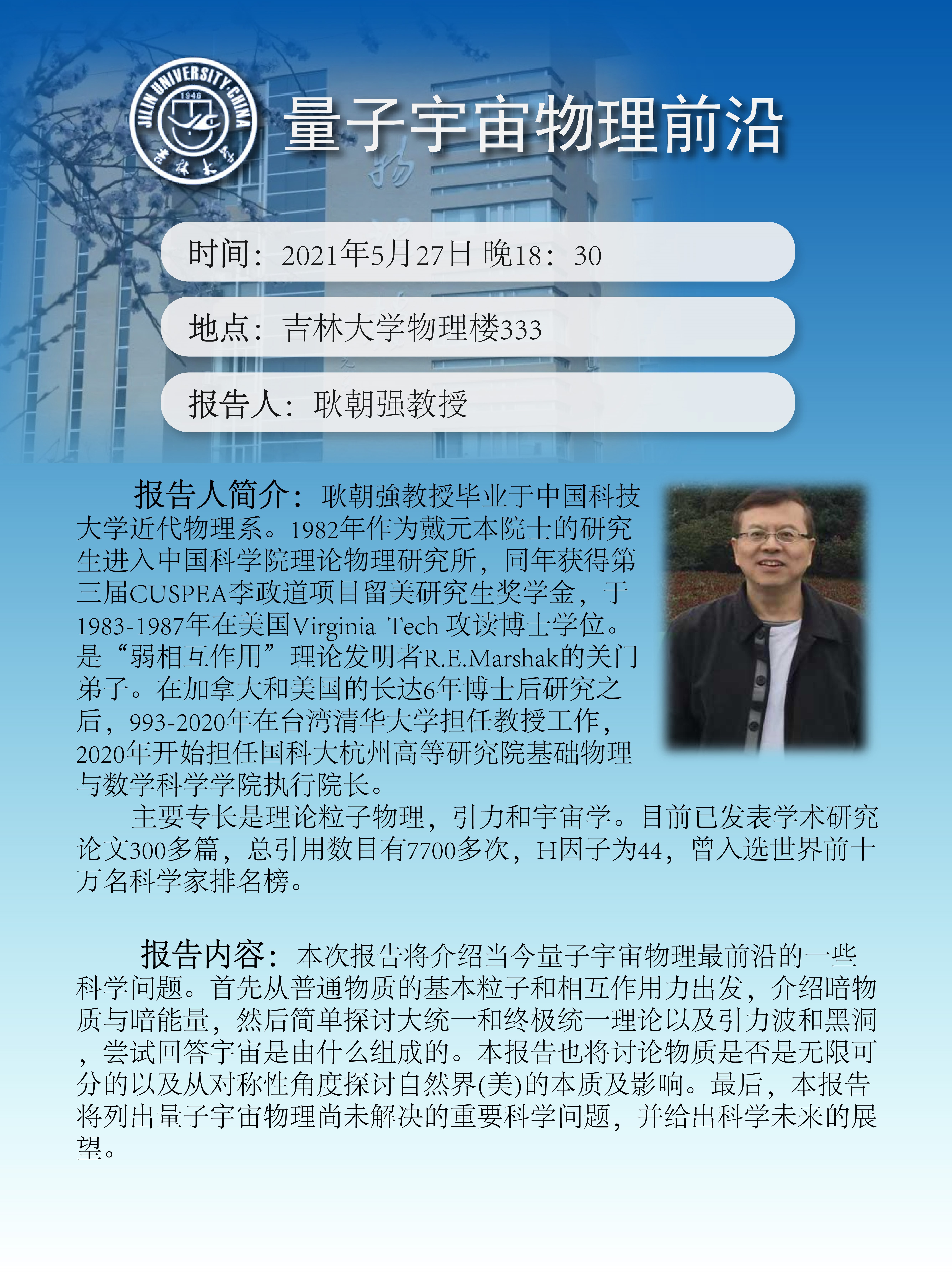 报告题目:量子宇宙物理前沿