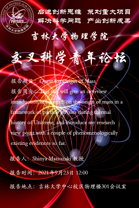 Prof. Shinya Matsuzaki is currently a professor of College of Physics and a member of Center of Theoretical Physics, college of physics. He obtained Ph. D degree in Physics, Nagoya University in 2007 in Japan. After a couple of postdoctoral studies in University of North Carolina (2007 – 2009, U.S.A.), Pusan National University (2009 – 2011, South Korea) and Maskawa Institute of Science and Culture, Kyoto Sangyo University (2011 – 2013, Japan), he worked at Nagoya University as a designated assistant professor in 2013, until April, 2018. Currently he has joined in Center of Theoretical Physics and College of Physics, Jilin University as a full professor, from October, 2018.