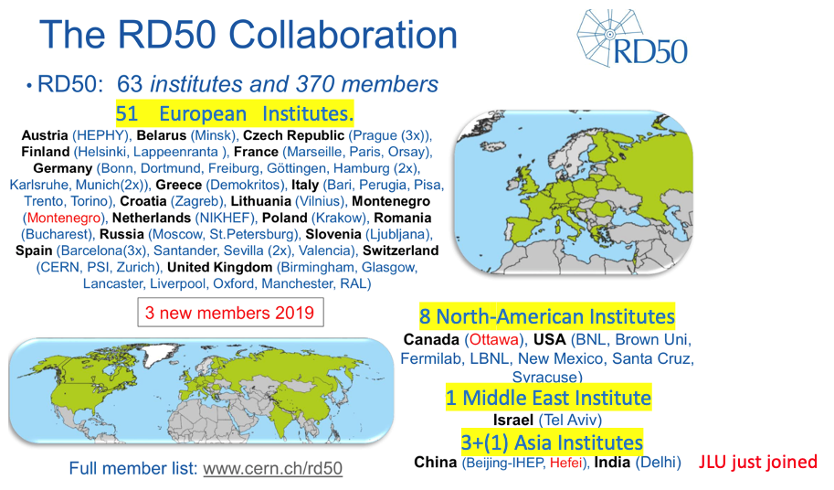 RD50国际合作组是欧洲核子中心(CERN)发起的专注于研发抗辐照半导体探测器的大型学术共同体,该共同体内各成员单位彼此共享信息和资源。成员单位包括欧洲、亚洲、美洲的60多个在该领域引领前沿的研究机构,例如欧洲的牛津大学、哥廷根大学、苏黎世联邦工业大学、莫斯科大学,美国的费米国家实验室、布鲁克海文国家实验室、劳伦斯伯克利国家实验室等。中国已有的成员单位包括中国科学院高能物理研究所和中国科学技术大学。