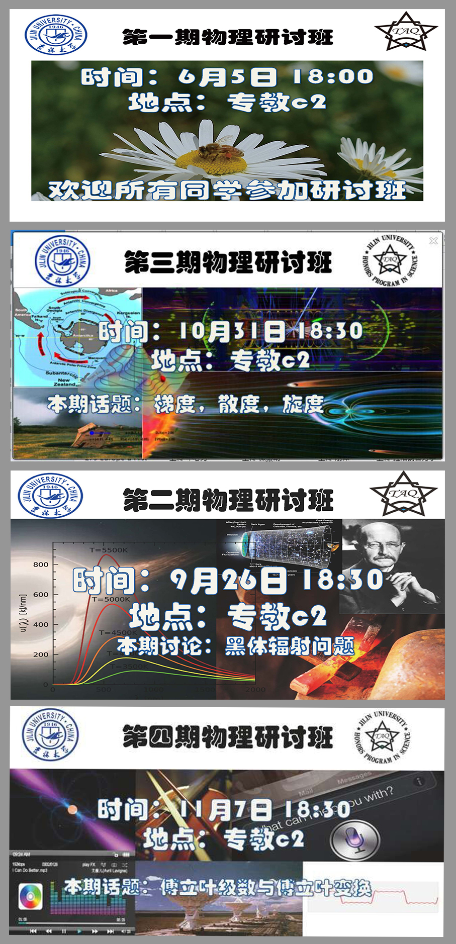 物理研讨班”目前已举办了七期,内容涉及“玻色爱因斯坦凝聚”,“黑体辐射”,“梯度,旋度,散度”,“傅立叶级数与傅立叶变换”,“熵”,“量子光学(光与原子相互作用)”,“斯特恩-盖拉赫实验”等等,每期活动时长约为2个小时,得到了suncitygroup太阳集团相关教师的大力支持。