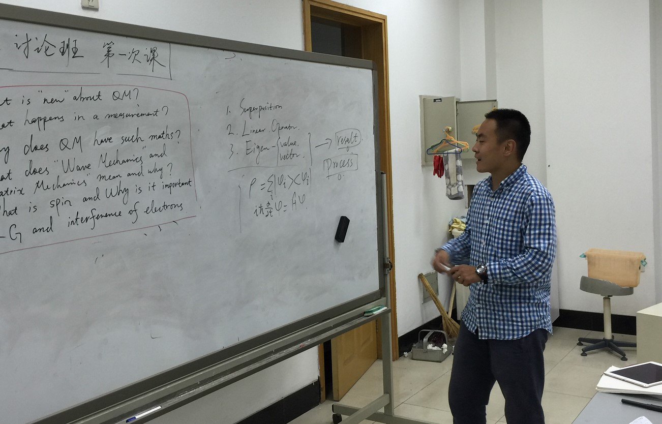 在第一类研讨班中,组织者会收集本年级同学在学习过程中反映的问题,并在每周的研讨班上组织、引导大家对这些问题进行讨论和拓展。这种提出问题、讨论问题的过程,激发了同学们对相关学科的兴趣和热情,加深了对物理概念和现象的理解,锻炼了组织准确精练语言表达自己学术观点的能力。而在第二类研讨班中,同学们会根据自己的特长和爱好,共同选定感兴趣的高阶课程,进行学习讨论。参与讨论的组员会轮流在研讨班上讲授该课程的某个章节。在熟练掌握本科课程内容的基础上,讨论者们能够在高阶课程的学习和讲授过程中,尽快接触到物理的前沿内容,从而既能感知前沿,又能扎实基础,学以致用,学有所成。