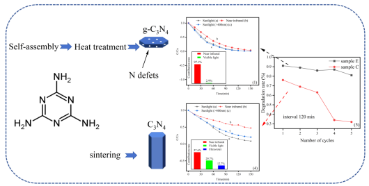 自然水体中有机污染物的室温/红外光降解是环境治理难题,传统催化剂在该波段效率低下。g-C₃N₄虽具潜力,但其二维平面扩展程度和氮缺陷调控机制尚不明确,制约其红外光催化能力。研究团队通过理论模拟-实验验证双轨策略,取得重要进展。DFT模拟揭示:材料平面扩展与氮缺陷导致吸收光谱红移,形成亚带隙能级,激发能降低到小于1.63eV,光响应范围拓宽至红外区,突破传统g-C₃N₄仅响应紫外-可见光的局限。