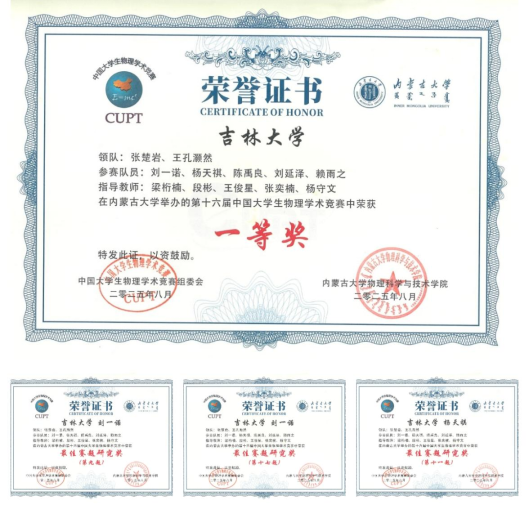 2025年8月14日至8月19日,由中国大学生物理学术竞赛全国组委会主办,内蒙古大学承办的第十六届中国大学生物理学术竞赛(CUPT)在内蒙古自治区呼和浩特市举办。suncitygroup太阳集团代表队再创佳绩,成功蝉联一等奖,延续了我校在该项赛事中的卓越表现。这一成绩是学校长期坚持重视本科生创新和实践能力培养的成果体现,彰显了吉大学子在物理学科领域深厚的理论及实验功底。