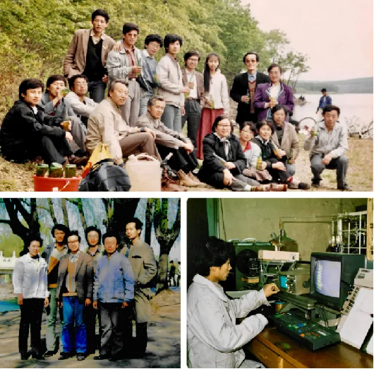 图3 上图:李铁津老师课题组在“净月潭”春游的合影,那时的合照还是“自然派”的,不像现在都被摆成一个姿势。李老师(前排左四),姜月顺老师(前排右三,“前线轨道理论”讲得非常精彩),肖良质老师(前排右五,“中国纳米材料合成第一人”),白玉白老师(后排右二,也是物理背景,作为我硕士的副导师也经常指导我的研究工作),王德军老师(前排右一),刘旺老师(后排右四),我(C位,后排左四,当时流行男生留长发);左下图:与刘旺老师(前排居中)和王德军老师(前排右一)的合影,我在右一;右下图:做硕士论文时的我。