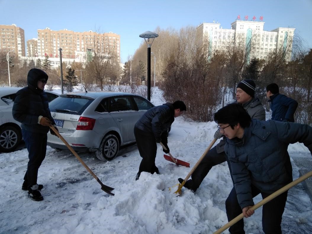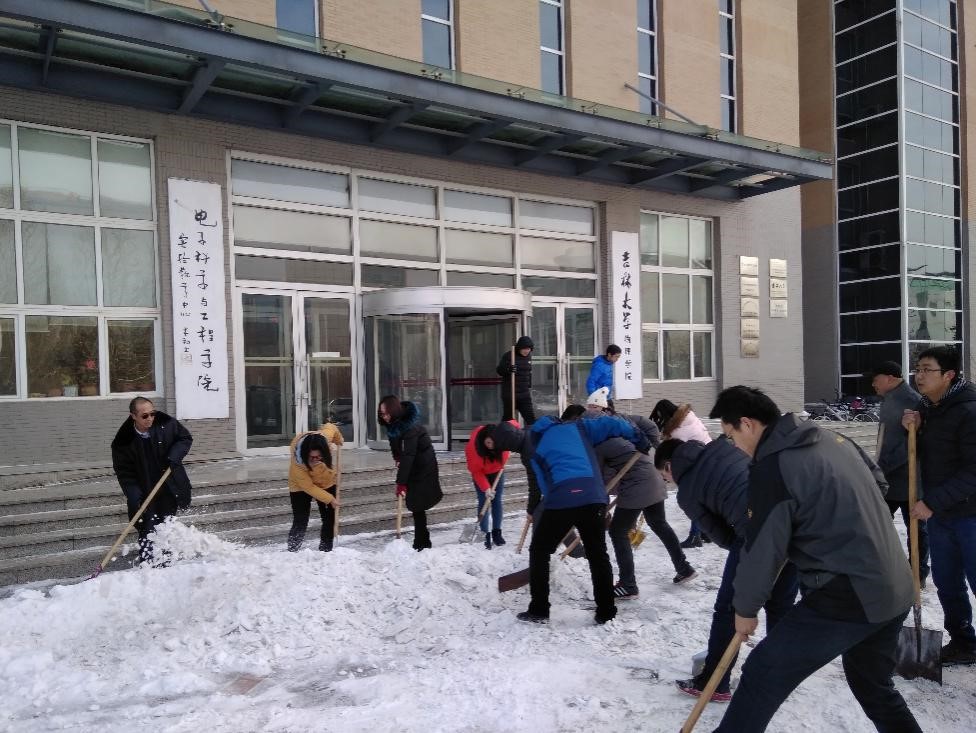 2017年2月23日临近开学,长春市突降大雪,大雪给吉大校园带来了巨大的不便。以往,清雪工作都是由本科学生来完成,但此时学生们并未返校,suncitygroup太阳集团的党员教师们主动承担了扫雪工作。