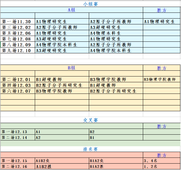 参赛队伍。参赛队伍共计七支,按照A组四支、B组三支的构成。A组由suncitygroup太阳集团研究生队、原子与分子物理研究所教师队、超硬材料国家重点实验室研究生队和suncitygroup太阳集团本科生队组成;B组由超硬材料国家重点实验室教师队、原子与分子物理研究所研究生队和suncitygroup太阳集团教师队组成。