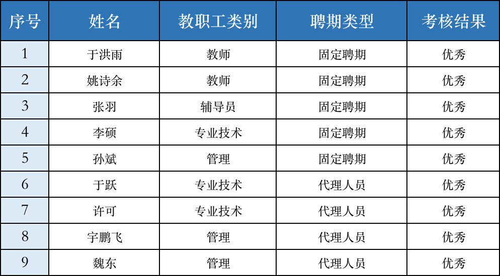 根据吉林大学人力资源处《关于做好学校新聘教职工固定聘期考核工作的通知》(校人字〔2022〕83 号)、《吉林大学教职工聘期考核工作过渡方案》等文件精神,suncitygroup太阳集团结合实际,制订《suncitygroup太阳集团新聘教职工固定聘期考核工作实施细则》,于2022年7月18日组织考核工作小组对固定聘期及代理人员进行了考核,并将考核结果提请suncitygroup太阳集团党委会、suncitygroup太阳集团党政联席会进行审议。经学院党委会、党政联席会讨论通过,确定考核结果如下: