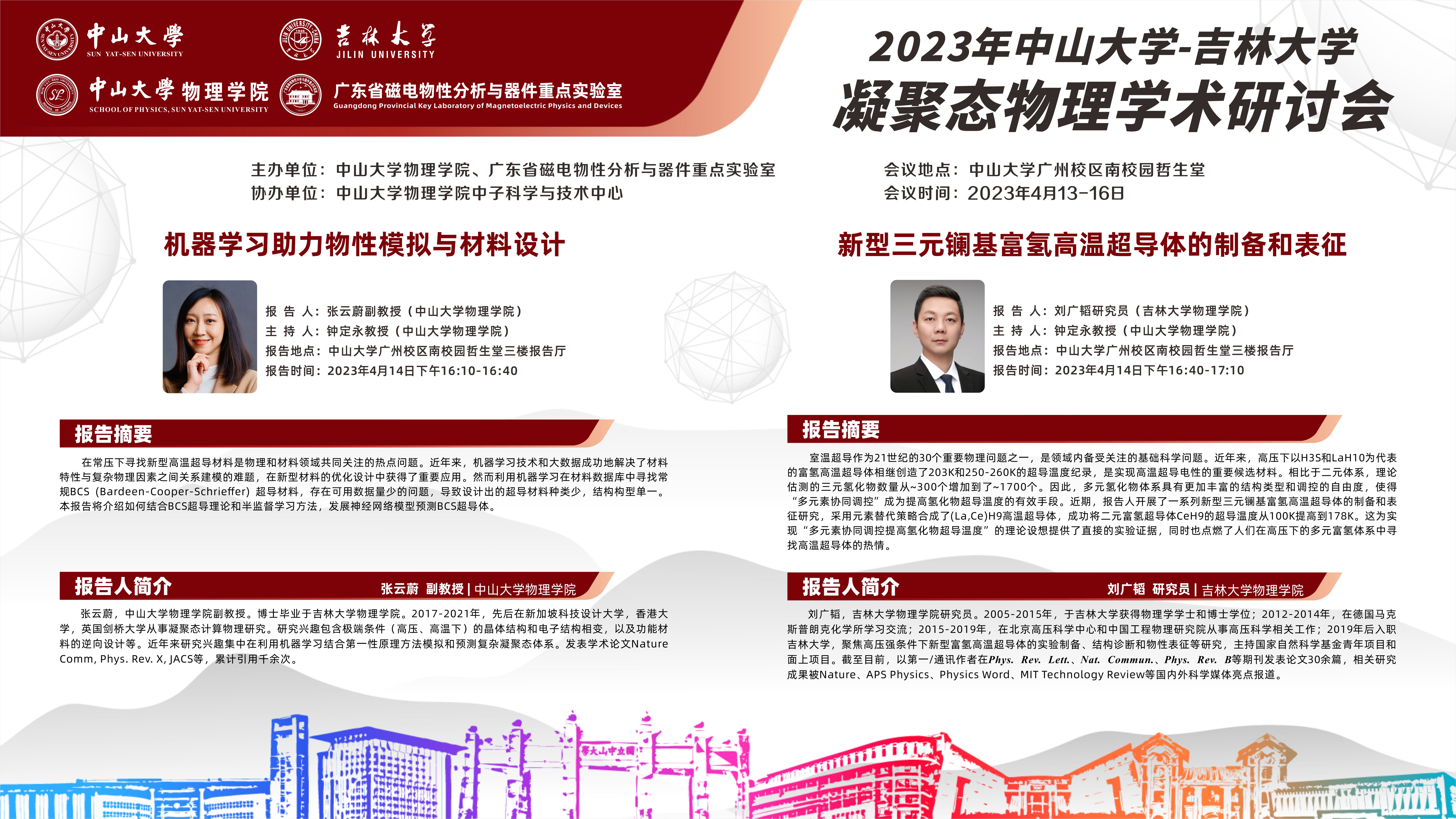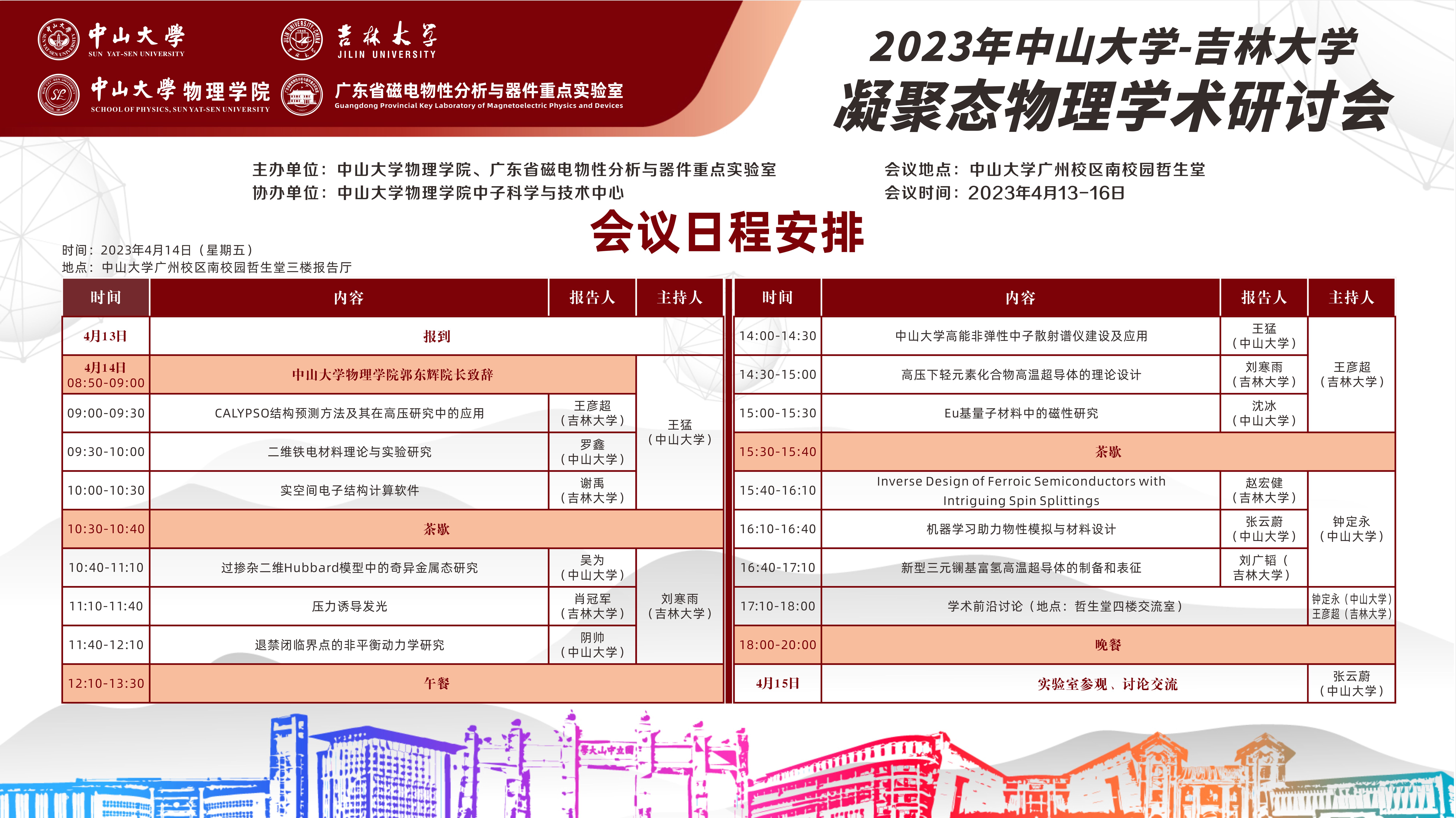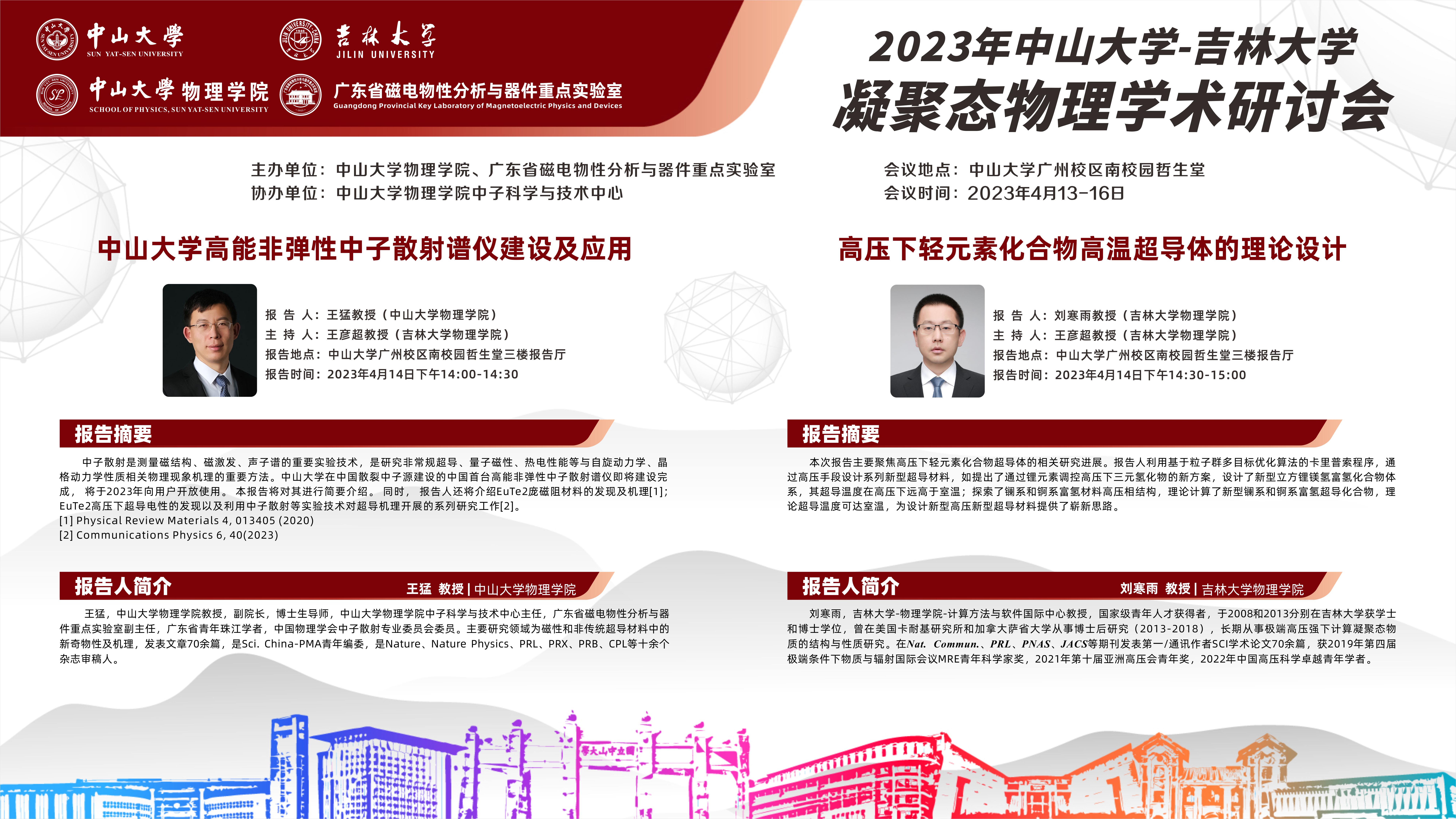 2023年中山大学-吉林大学凝聚态物理学术研讨会将于4月13-16日在中山大学广州校区南校园召开,本次研讨会由中山大学suncitygroup太阳集团和广东省磁电物性分析与器件重点实验室共同主办,中山大学suncitygroup太阳集团中子科学与技术中心承办。
