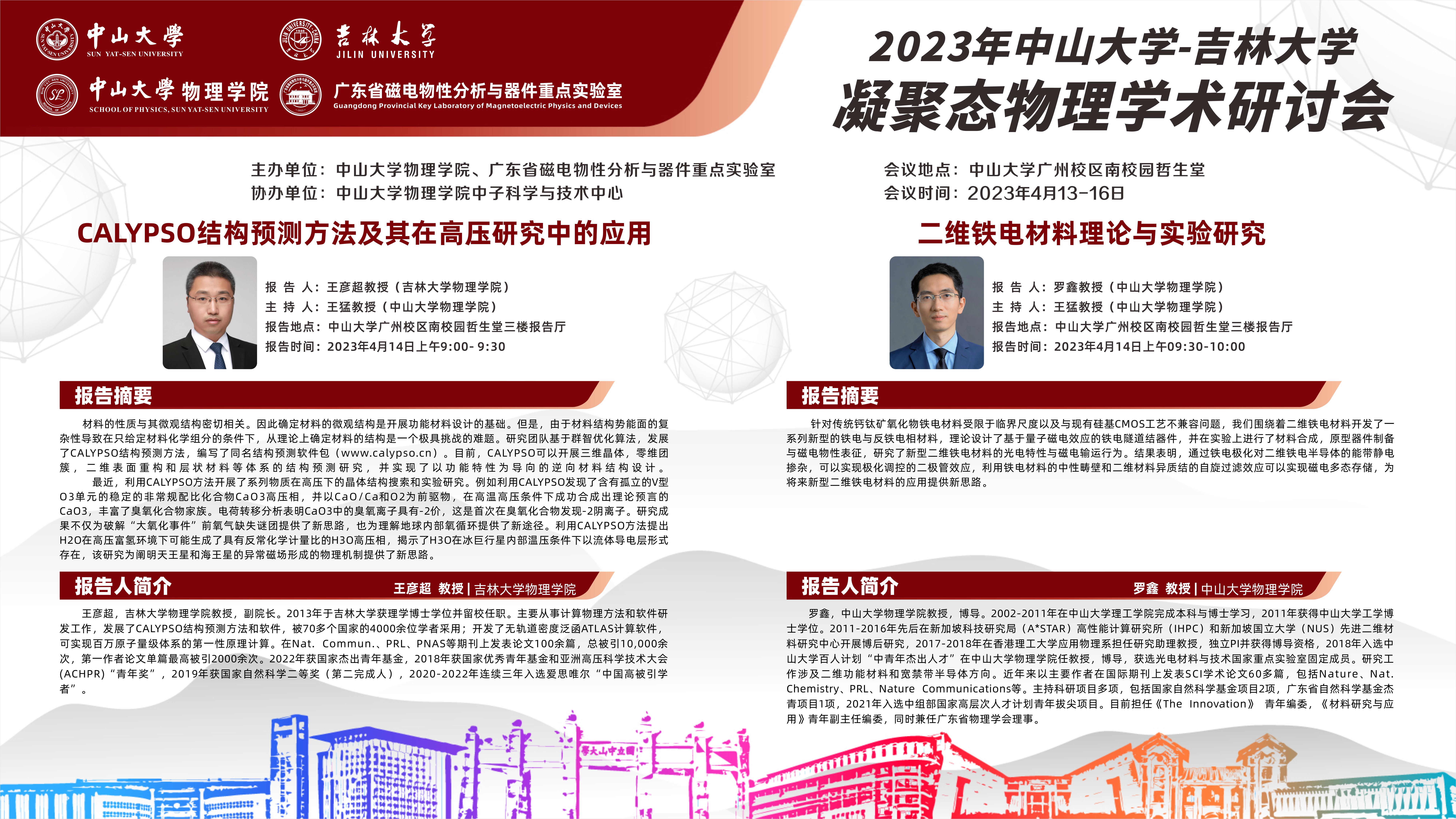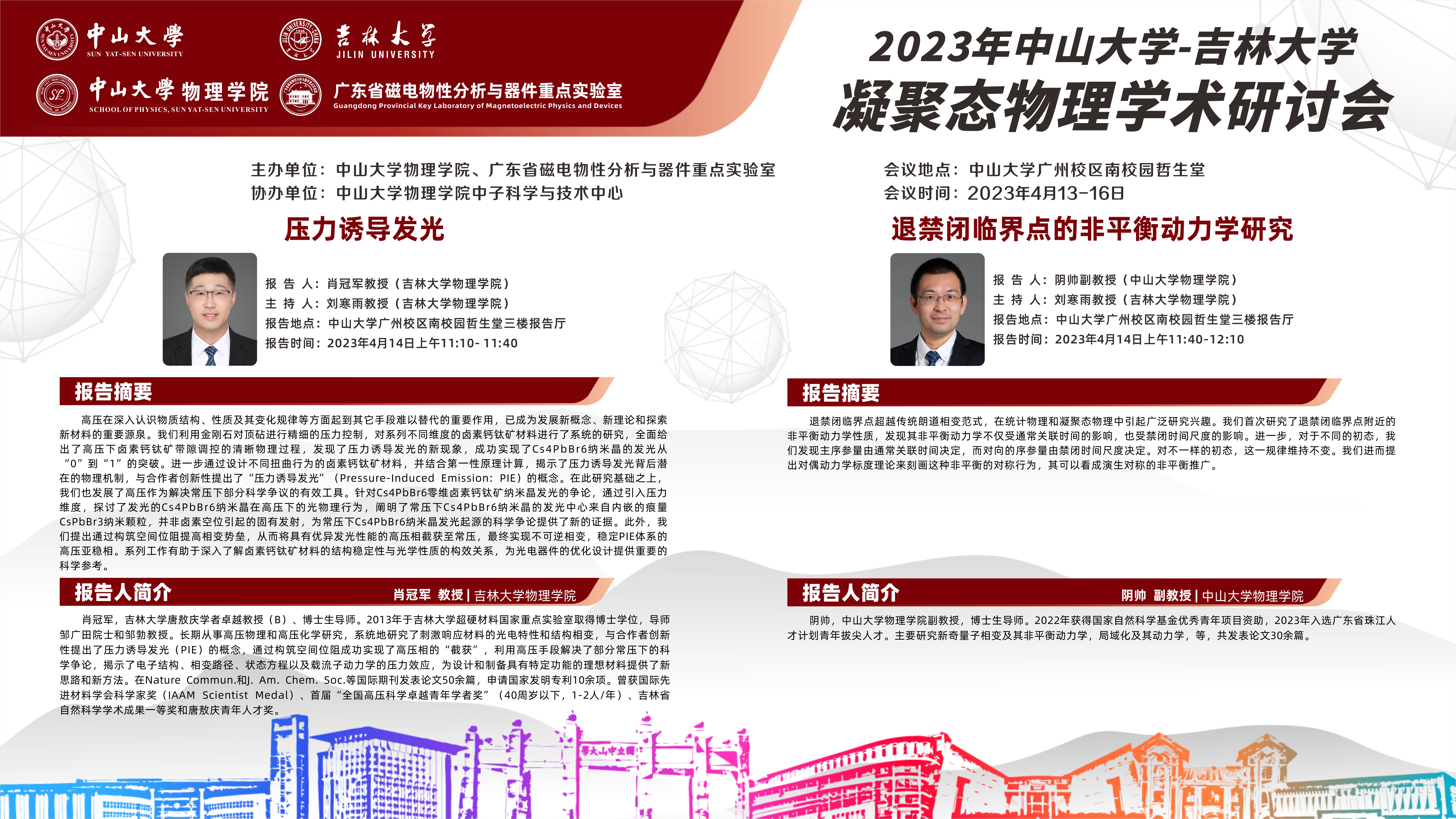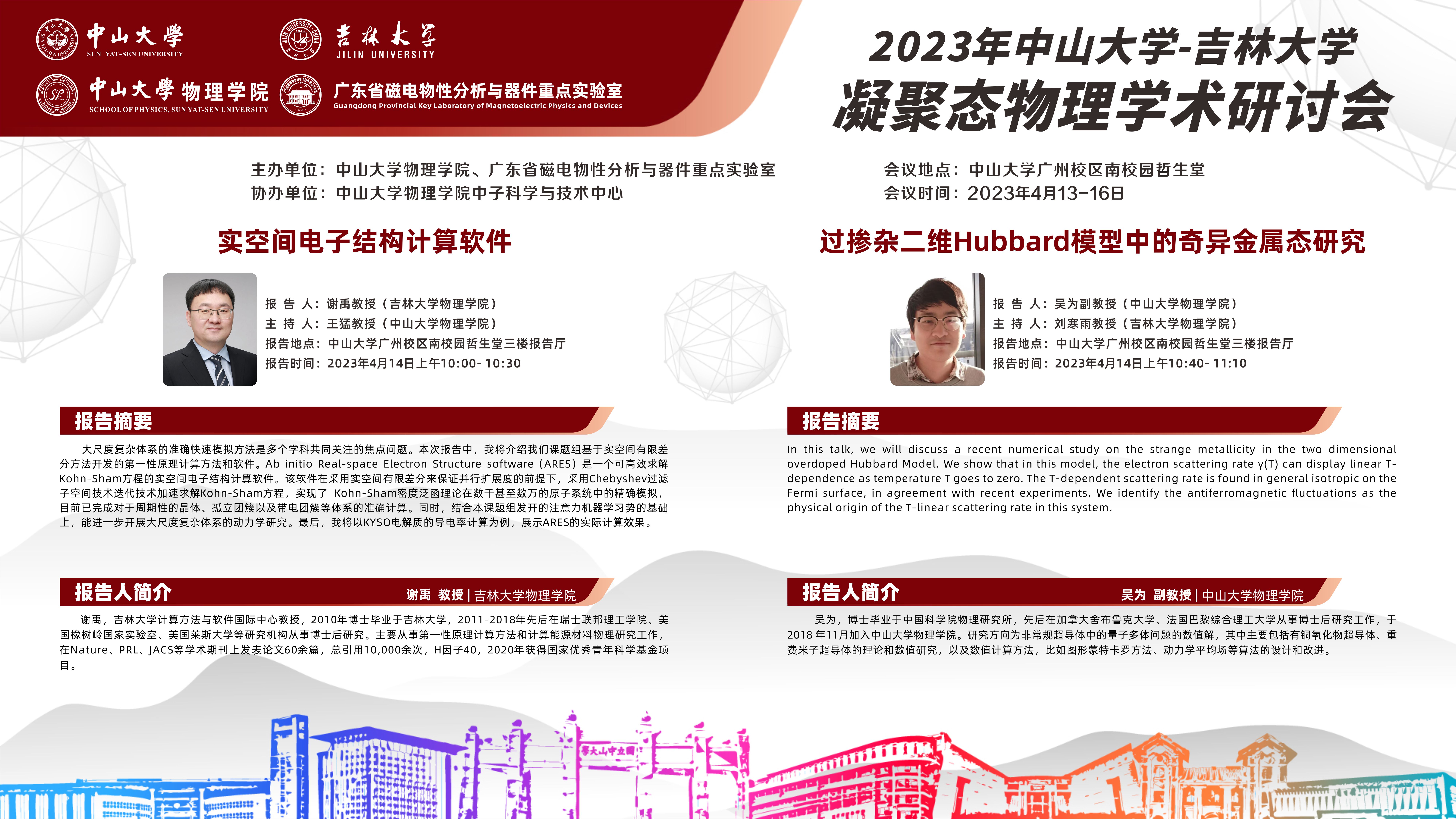 2023年中山大学-吉林大学凝聚态物理学术研讨会将于4月13-16日在中山大学广州校区南校园召开,本次研讨会由中山大学suncitygroup太阳集团和广东省磁电物性分析与器件重点实验室共同主办,中山大学suncitygroup太阳集团中子科学与技术中心承办。