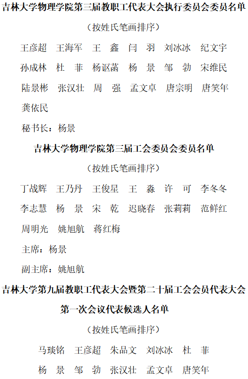 根据《关于开展基础工会、二级教代会换届工作的通知》(校工字【2023】4号)、《关于做好吉林大学第九届教职工代表大会暨第二十届工会会员代表大会第一会议代表选举工作的通知》校工字【2023】5号)等通知精神,suncitygroup太阳集团于3月31日召开了suncitygroup太阳集团第三届教职工代表大会暨第三届工会会员代表大会,选举产生了suncitygroup太阳集团第三届教职工代表大会执行委员会委员、suncitygroup太阳集团第三届工会委员会委员、吉林大学第九届教职工代表大会暨第二十届工会会员代表大会第一次会议代表候选人。随后,学院组织召开了suncitygroup太阳集团第三届教职工代表大会执行委员会第一次会议、suncitygroup太阳集团第三届工会委员会第一次会议,选举产生了学院第三届教职工代表大会执行委员会秘书长以及第三届工会委员会主席、副主席。