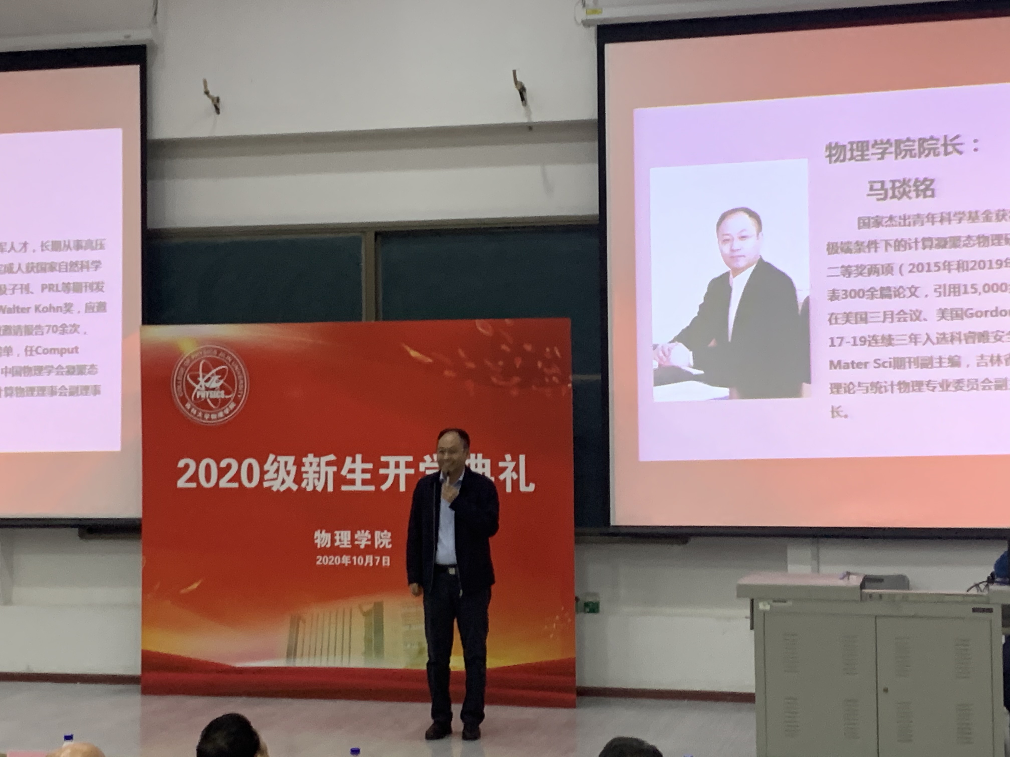 开学典礼在庄严的奏唱国歌声中拉开帷幕。首先,典礼通过播放suncitygroup太阳集团和suncitygroup太阳集团院长奖学金的视频宣传片,让同学们对学院有了初步的了解。随后,2020级新生代表、新生奖学金获得者、来着云南的刘林维同学代表全体新生发言。他表达了对吉林大学和大学生活的美好憧憬,号召全体新生坚持学习,乐于发现,勇敢追求真知和梦想,做个让自己骄傲的物理人。2017级唐敖庆班(物理方向)的宋翰林同学代表全体suncitygroup太阳集团在校学生发言。他结合个人经历,课程学习,科研项目,交流访学,课余生活四个方面,向新生分享了自己对大学学习生活的理解,号召同学们珍惜时光,莫负韶华。