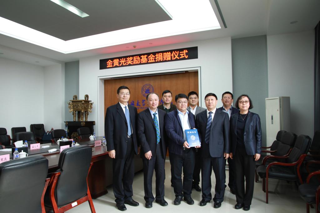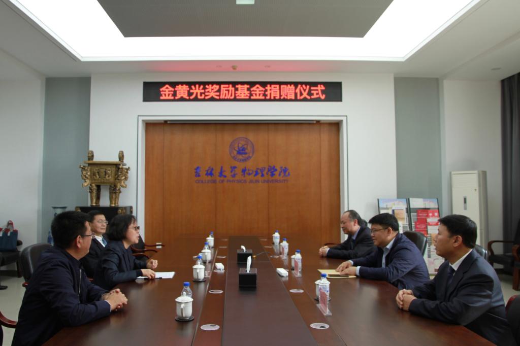 2020年9月21日上午,吉林大学“金黄光奖励基金”捐赠仪式在物理楼301会议室举行。suncitygroup太阳集团杰出校友中国科学院院士江风益、南昌金黄光半导体照明有限公司董事长杨俊宁、吉林大学副校长郑伟涛、吉林大学校友联络和教育基金管理处处长迟宪良、suncitygroup太阳集团党委书记孟文卓等出席捐赠仪式。仪式由suncitygroup太阳集团党委书记孟文卓主持。
