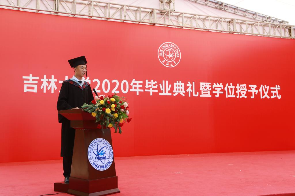 王本全代表全体本科毕业生发言,回顾在suncitygroup太阳集团的点点滴滴,向承载了同学们四年青春梦想的suncitygroup太阳集团,向所有师长和亲友,表达了将传承“红、白、黄”三原色精神,秉持吉林大学“求实创新、励志图强”的校训,不断进取,扬帆远航。