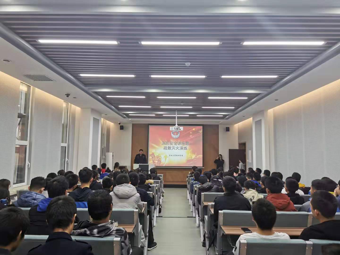 讲座由保卫处消防科董立明老师主讲,董老师首先结合近几年发生的校园火灾安全事故指出消防安全工作的重要性。随后,通过案例指出了寝室、实验室、办公室三个场所使用违禁电器的危害,提醒师生一定要遵规守纪,切不可掉以轻心。针对提高安全意识,规范个体行为;加强管理,杜绝违规操作;强化灭火疏散演练,提升消防安全技能,三方面对学院消防工作做了具体指导。最后,董老师通过一段火灾自救逃生视频,详细讲解了火灾发生时的逃生技巧与注意事项。