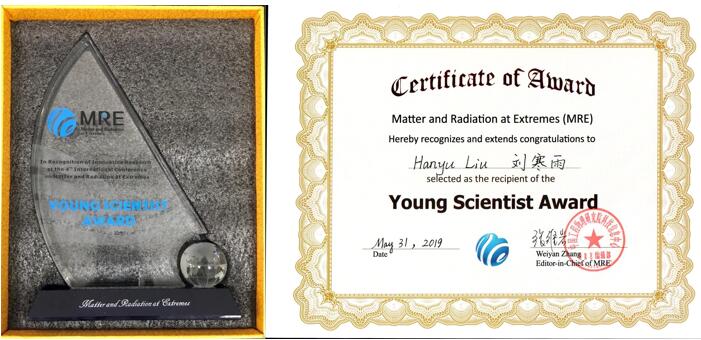 2019年5月31日,第四届国际极端条件下的物质与辐射学术会议(ICMRE)将“MRE青年科学家奖”(MRE Young Scientist Award)授予suncitygroup太阳集团刘寒雨教授。刘寒雨教授是三位获奖者之一。
