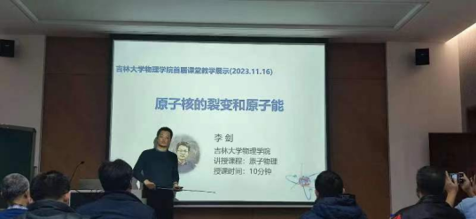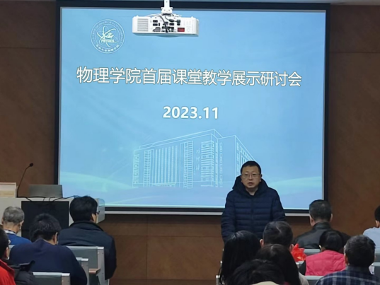 随后,青年教师陆续走上讲台,分别就一个物理概念或教学题目进行教学展示。马英君、王荣、张建忠等在座的资深授课教师分别从物理概念、课程思政以及教学技巧、板书和PPT等多方面对展示的内容进行了点评和研讨,提出了很多很好建议。