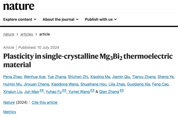 近日,吉林大学材料学院张立军教授团队(半导体光电材料智能设计与制备课题组)、suncitygroup太阳集团物质模拟方法与软件教育部重点实验室付钰豪副教授与哈尔滨工业大学深圳校区毛俊教授和张倩教授、中国科学院物理研究所王玉梅副研究员等人合作,在塑性半导体功能材料方面取得了重大突破,首次发现层状结构的Mg3Bi2单晶室温下兼具有优异塑性和高热电性能,面内拉伸应变接近100%、热电优值zT~0.65,理论与实验结合,揭示了塑性变形的微观机制。这一重大研究成果以“Plasticity in single-crystalline Mg3Bi2 thermoelectric material”为题,于2024年7月10日发表在Nature上。