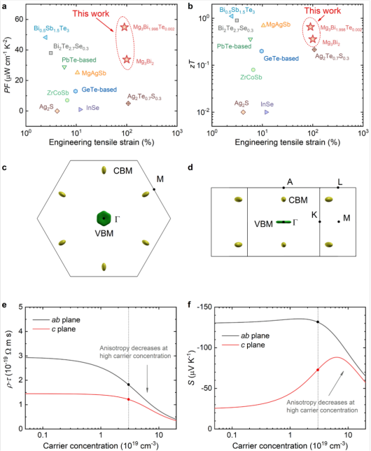除优异的塑性变形能力外,优化后的Mg3Bi2单晶在室温下还表现出高的热电性能。例如,室温下Te掺杂的Mg3Bi1.998Te0.002单晶在面内方向的热电功率因子(PF)达到了55μWcm-2K-2,热电优值zT~0.65。理论计算表明,其面内较高的PF值主要源于价带顶附近特殊的费米面(碟状),显著增大了面内的Seebeck系数。