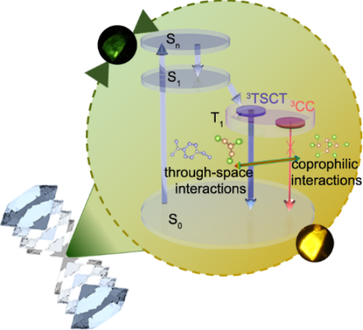 在本工作中,隋永明课题组选择常压下具有TSCT发射特性的Cu4I6(4-dimethylamino-1-ethylpyridinium)2离子型铜碘簇作为范例,利用静水压强直接调制亲铜相互作用和TSCT相互作用在具有增强的强亲铜相互作用情况下,首次实现了离子型铜碘簇奇异的压致蓝移发射。高压原位XRD和IR表明,在亲铜相互作用和空间相互作用的竞争中,压强驱动了更具优势的TS相互作用,空间相互作用的竞争优势归因于分子间C-H…I新氢键以及增强的范德瓦尔斯相互作用。这种空间作用实现了从阴离子簇核到有机阳离子的离域,产生了主导的3TSCT发射,同时抑制了低能3CC态的形成。理论计算和飞秒瞬态吸收技术给出了相应的激发态弛豫模型,证实了蓝移发射源于更强空间作用下电子离域导致的激发三线态和基态能级间距增加。此工作深化压强调制发光性质的新认知,为设计合成具有TSCT高性能发射材料提供新思路。