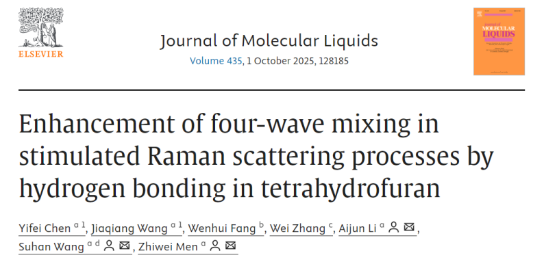近日,suncitygroup太阳集团2022级本科生陈奕霏等在门志伟教授的指导下,在氢键调控四氢呋喃(THF)混合溶液受激拉曼散射 (SRS)增强四波混频(FWM)过程取得进展。研究成果以“Enhancement of four-wave mixing in stimulated Raman scattering processes by hydrogen bonding in tetrahydrofuran”为题发表于《Journal of Molecular Liquids》上(DOI: 10.1016/j.molliq.2025.128185)。