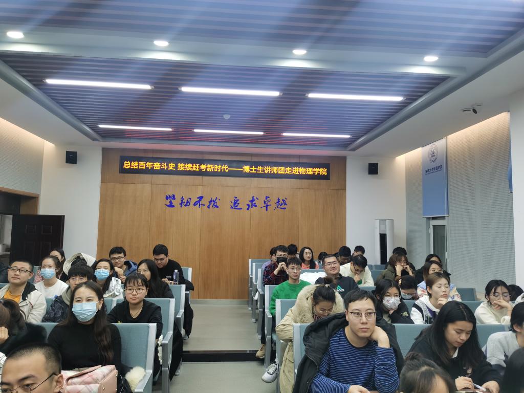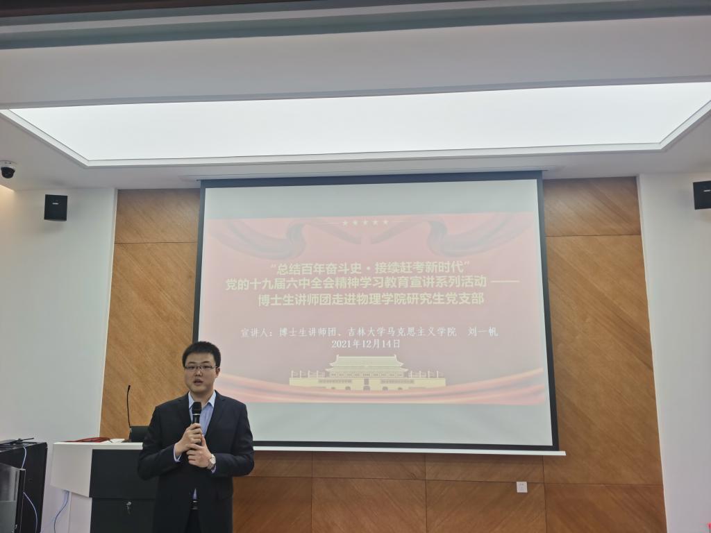 为深入学习贯彻党的十九届六中全会精神,提升广大研究生思想政治素质,积极响应校党委研究生工作部工作要求,2021年12月14日,suncitygroup太阳集团邀请吉林大学博士生讲师团讲师刘一帆博士在物理楼333会议室进行了十九届六中全会精神学习教育宣讲。本次宣讲的主题为“总结百年奋斗史·接续赶考新时代”——坚持自我革命,以伟大自我革命引领社会革命,学院研究生党支部党员、预备党员、研究生干部、德育助管共计100余人参与了此次宣讲活动。suncitygroup太阳集团曹鹏老师主持了本次宣讲。