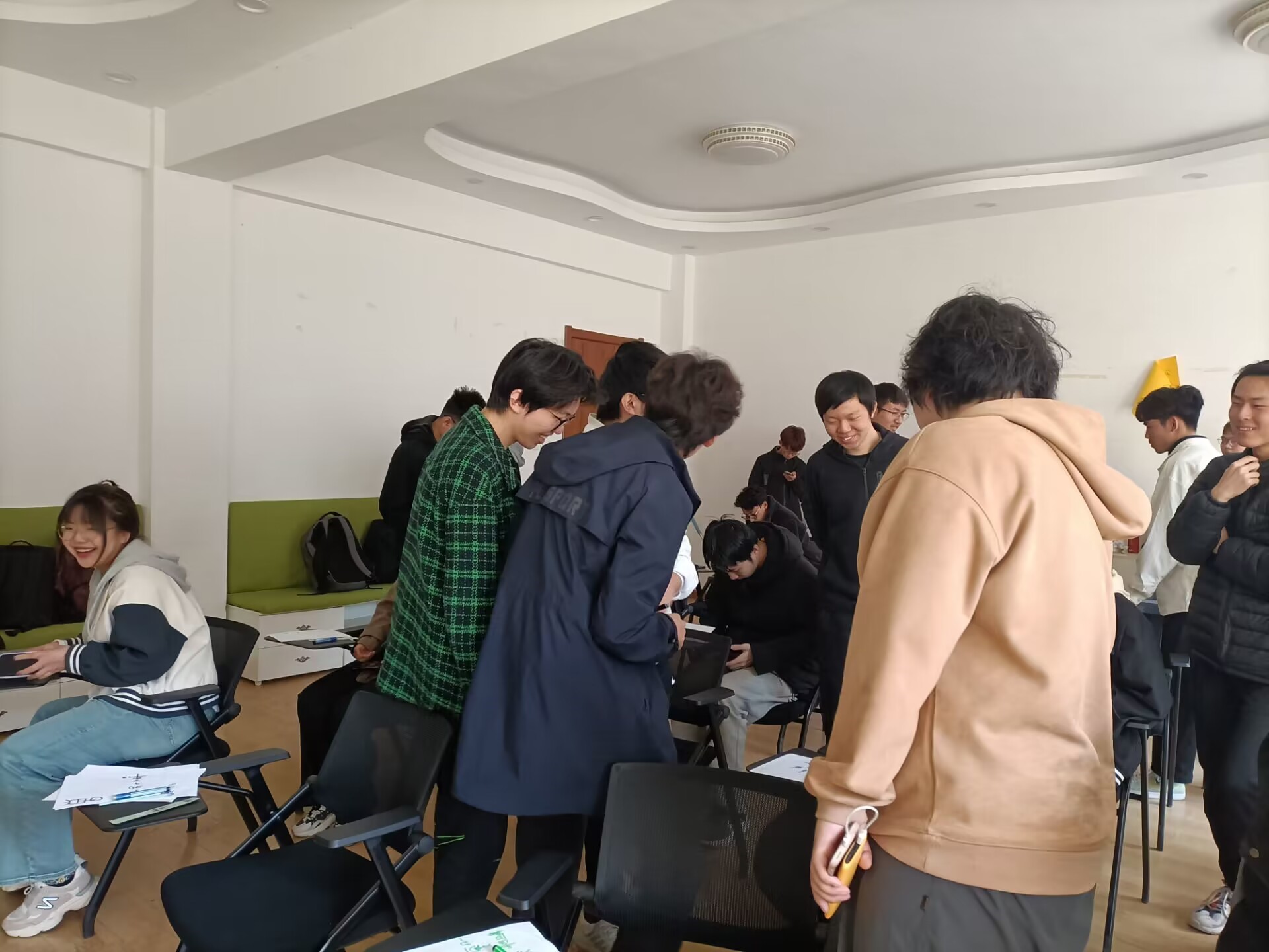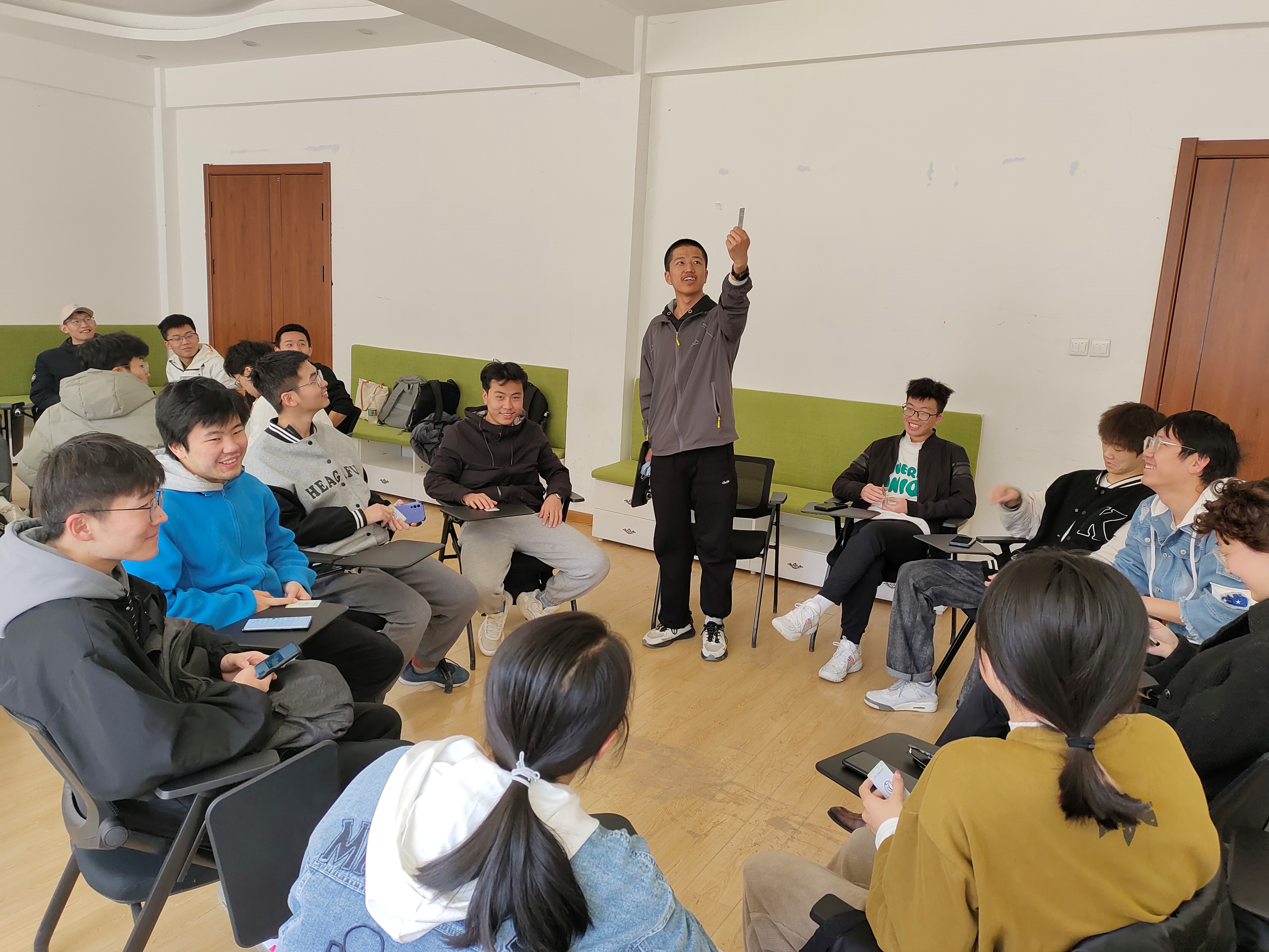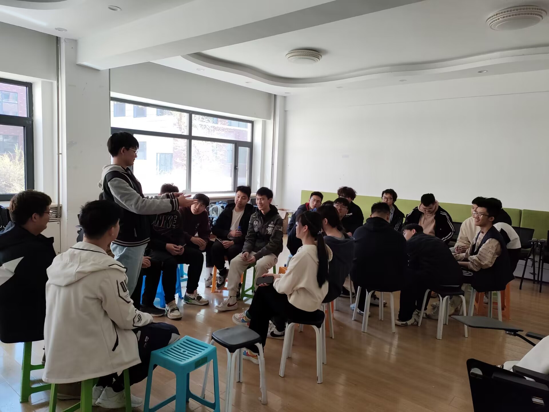同学们分组进行自我介绍,并分别做一些放松动作。使参与者放松身体,同时处于兴奋状态。