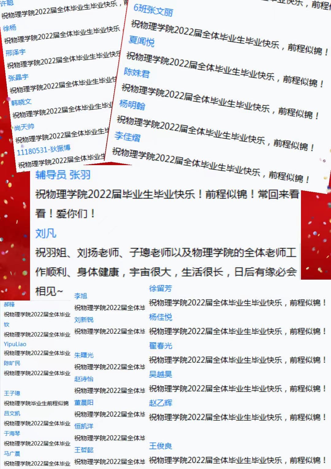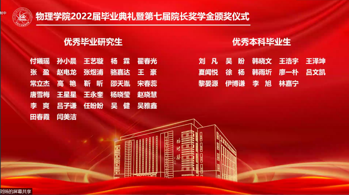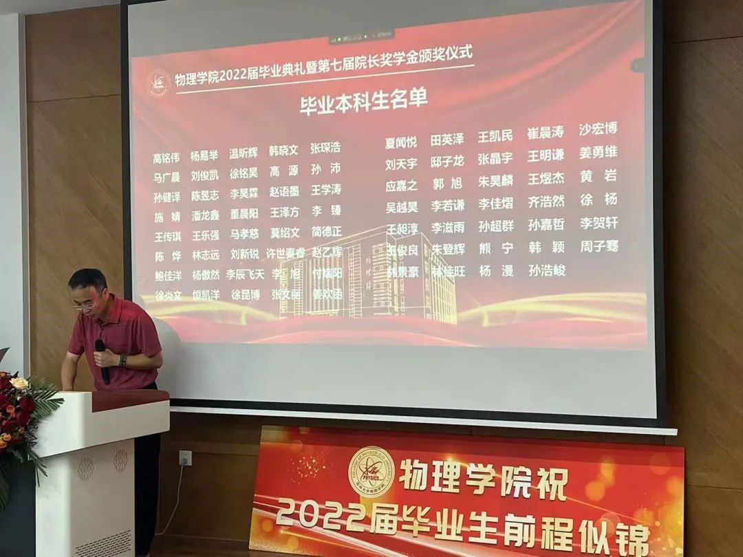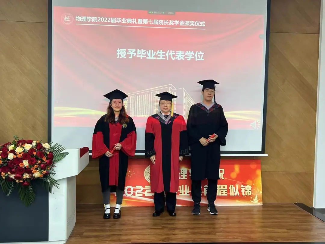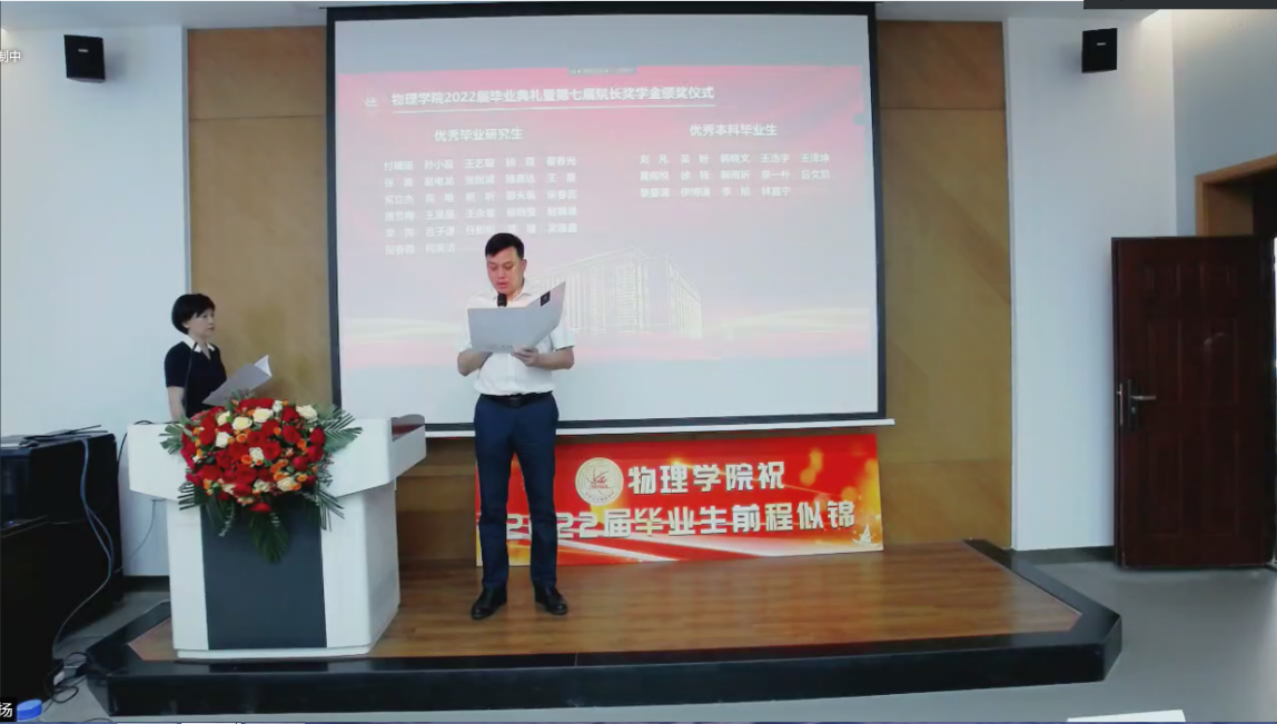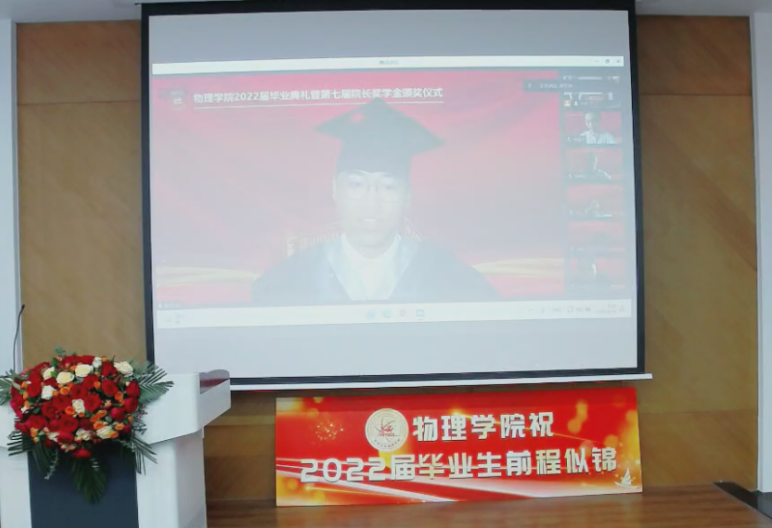 2022年6月19日上午9:00,suncitygroup太阳集团2022届毕业典礼暨第七届院长奖学金颁奖仪式隆重举行。suncitygroup太阳集团党委书记孟文卓、suncitygroup太阳集团院长邹勃、suncitygroup太阳集团党委副书记唐宗明、suncitygroup太阳集团副院长王海军、suncitygroup太阳集团副院长杜菲、suncitygroup太阳集团副院长杨景于物理楼参加典礼,各系主任、教师代表及全体毕业生于云端参加典礼。典礼由学院党委副书记兼副院长杨讴菡主持。