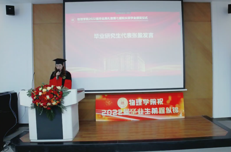 2022届毕业研究生代表张盈发言。回顾自身的学习经历,在科研这一场持久战上,她喜欢做科研时纯粹而又踏实的感觉,未来也将继续在科研的道路上走下去。最后,真诚地感谢老师们在一路上给予的鼓励、支持和引导,并向学院和老师献上真挚的祝福。