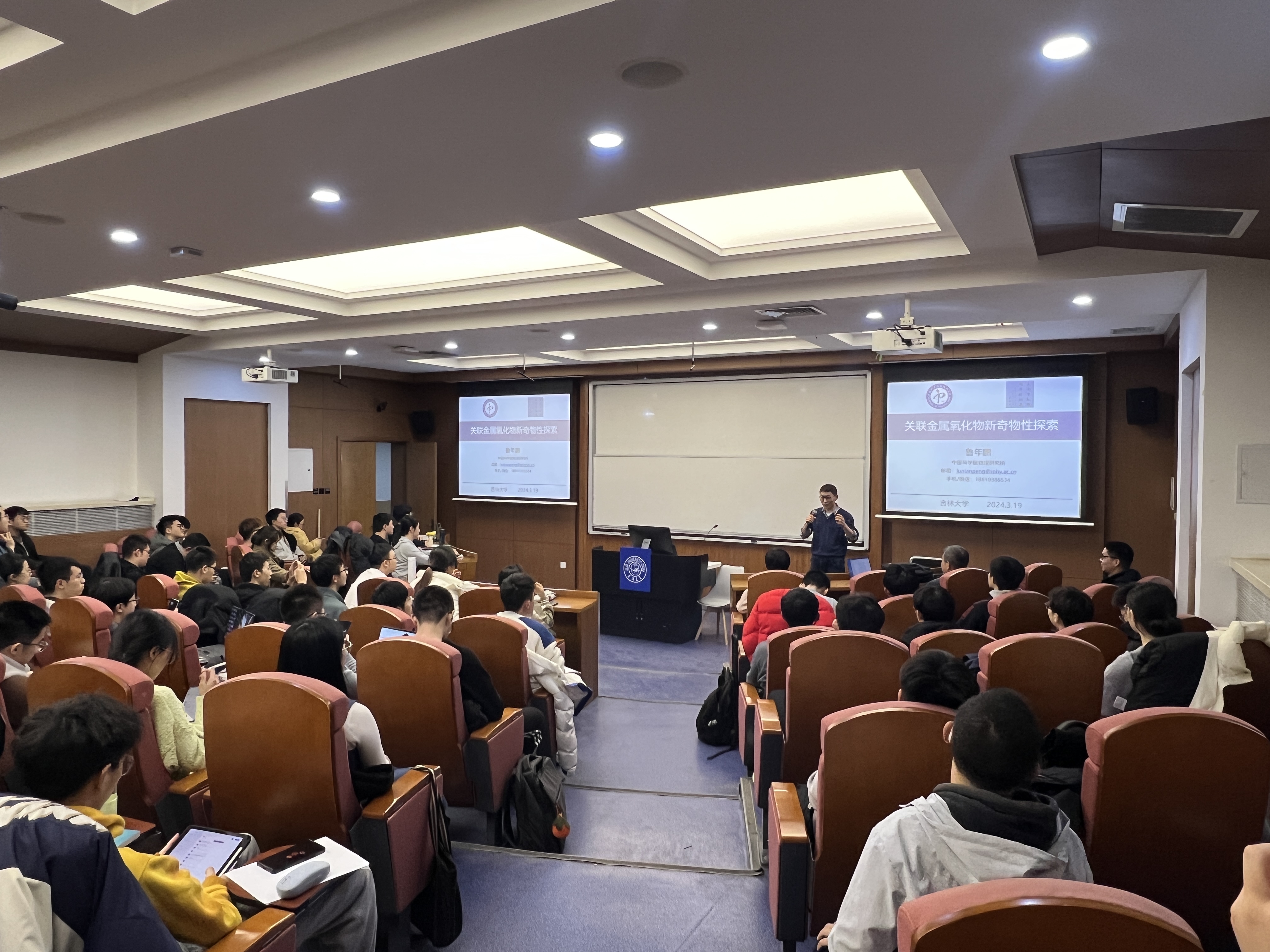 19日晚,物理所来访的老师们首先进行了学术交流宣讲会,suncitygroup太阳集团党委副书记兼副院长杨讴菡,本科生辅导员刘扬、车禹剑、赵一安出席活动。会场内座无虚席,同学们对宣讲会翘首以盼。首先杨讴菡书记为讲座进行了开场介绍,之后鲁年鹏特聘研究员、韩秀峰研究员先后进行了学术报告,分别介绍了各自领域内的主要进展、前沿问题和各自课题组的主要成果,回答了同学们踊跃的提问,并同同学们对双方关心的学术问题进行深入的交流探讨,会场内气氛热情澎湃。物理所的老师们还准备了物理所的研究生招生宣传册,向到场的同学们分发,针对suncitygroup太阳集团2021级同学提出的推免、考研等相关问题进行了解答。同学们由此对物理所有了更深入的了解。